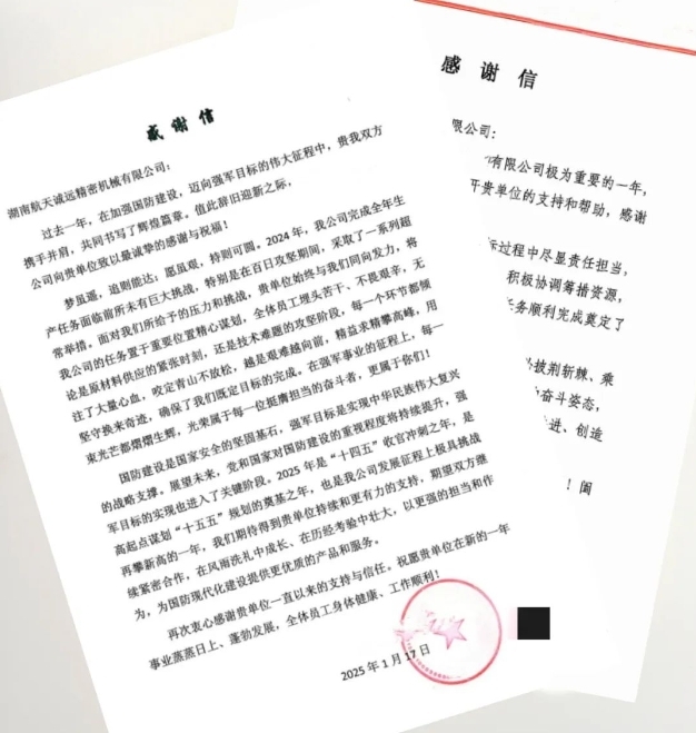 2025年農(nóng)歷年到來之際,湖南航天誠遠(yuǎn)公司陸續(xù)收到客戶單位發(fā)來的感謝信。