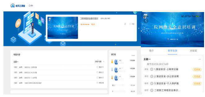在航天云課堂開設(shè)線上網(wǎng)絡(luò)安全意識(shí)培訓(xùn)和趣味競賽,主要包括個(gè)人信息保護(hù)、辦公安全、人工智能安全等網(wǎng)絡(luò)安全知識(shí)。全院5700余人次積極參加在線培訓(xùn)和競賽,130余名員工勇闖百關(guān),通過寓教于樂普及網(wǎng)絡(luò)安全知識(shí)。