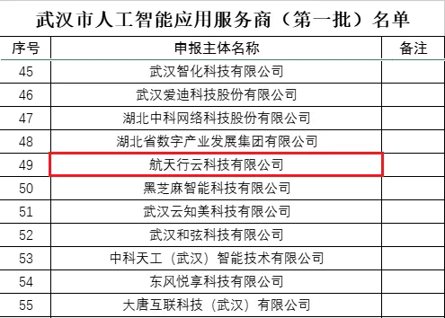 航天科工九院行云公司入選武漢市人工智能應(yīng)用服務(wù)商認(rèn)定名單