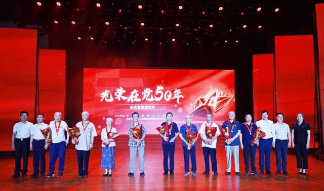 紀念章頒發儀式上,與會領導向老黨員頒發了光榮在黨50紀念章,并向老黨員致以崇高敬意。