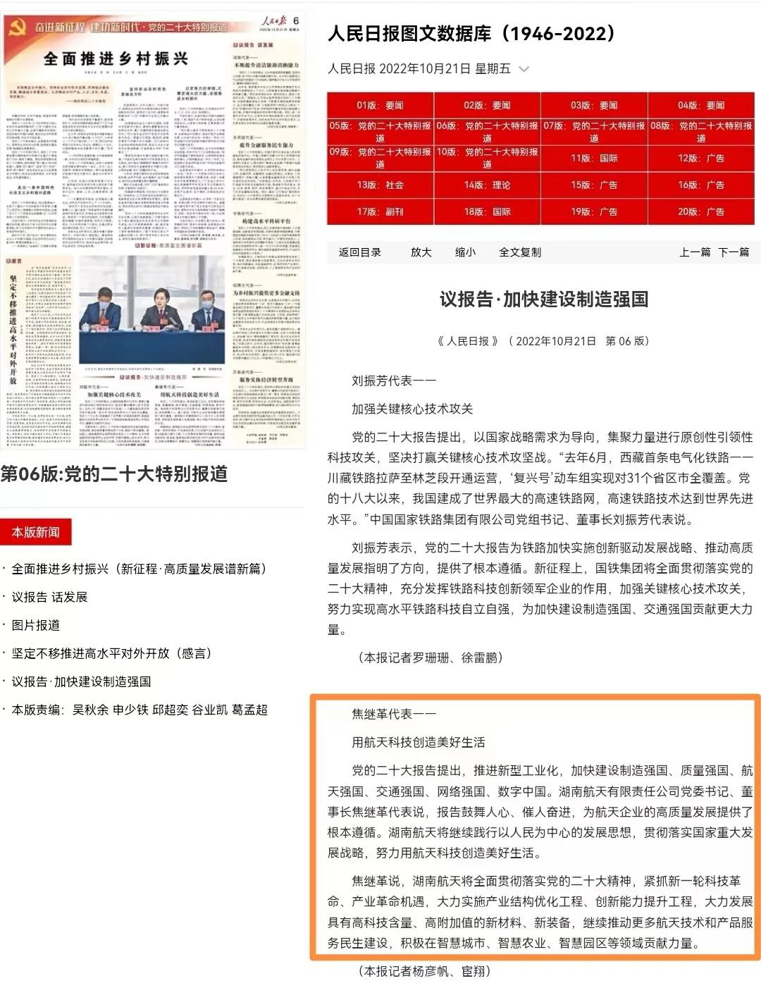 黨的二十大報告提出,推進新型工業(yè)化,加快建設制造強國、質(zhì)量強國、航天強國、交通強國、網(wǎng)絡強國、數(shù)字中國。湖南航天有限責任公司黨委書記、董事長焦繼革代表說,報告鼓舞人心、催人奮進,為航天企業(yè)的高質(zhì)量發(fā)展提供了根本遵循。湖南航天將繼續(xù)踐行以人民為中心的發(fā)展思想,貫徹落實國家重大發(fā)展戰(zhàn)略,努力用航天科技創(chuàng)造美好生活。