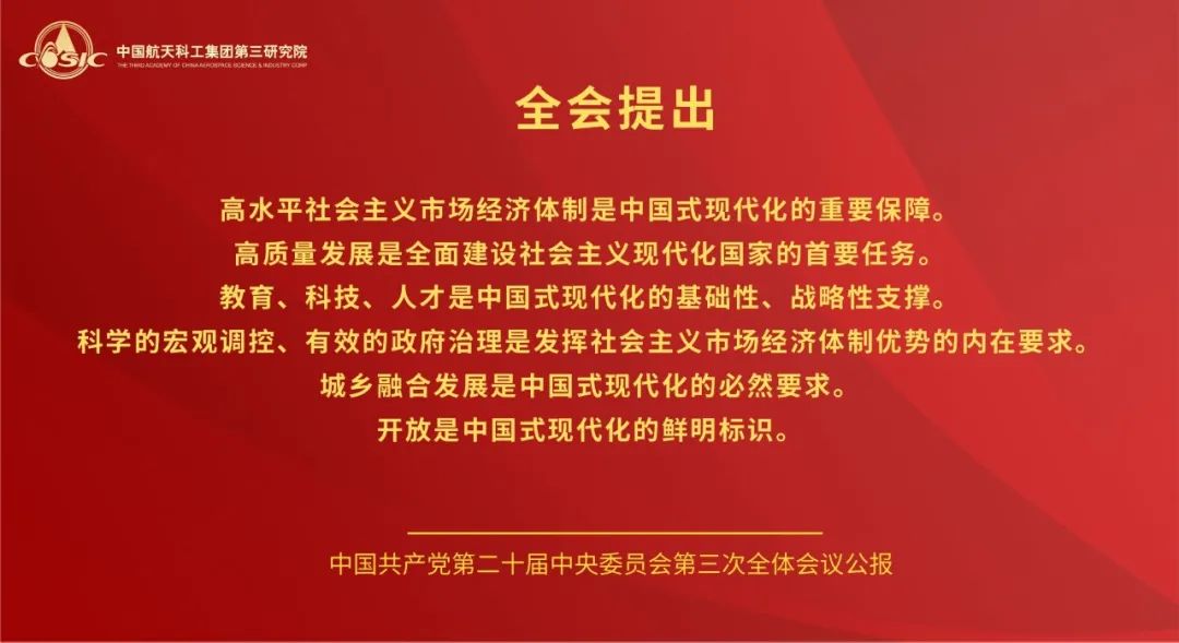 黨的二十屆三中全會,是在以中國式現代化全面推進強國建設、民族復興偉業的關鍵時期召開的一次十分重要的會議。航天三院黨委將學習好宣傳好貫徹好黨的二十屆三中全會精神作為當前和今后一個時期的一項重大政治任務,高度重視,迅速行動,引導三院全體黨員干部職工把思想和行動統一到全會精神上來,把智慧和力量凝聚到落實全會精神和部署上來,聚焦主責主業,履行強軍首責,持續推動飛航事業高質量發展。