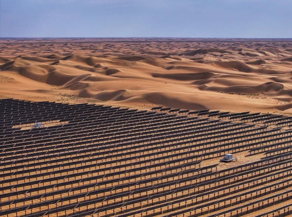 這是2025年6月5日拍攝的位于內蒙古巴彥淖爾市磴口縣的烏蘭布和東北部新能源基地100萬千瓦光伏先導工程項目(無人機照片)。該項目地處烏蘭布和沙漠。新華社記者 連振 攝