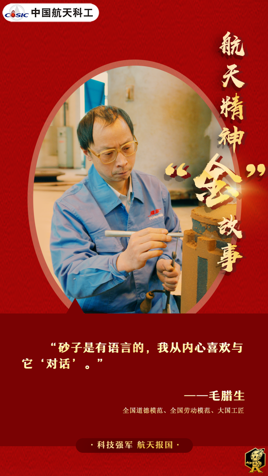 航天江南集團有限公司所屬航天風華公司的鑄造工人、全國道德模范毛臘生,秉持一顆匠心,堅守一份執著,40多年扎根一線與砂子“對話”,書寫新時代航天技能工人的敬業奉獻篇章。