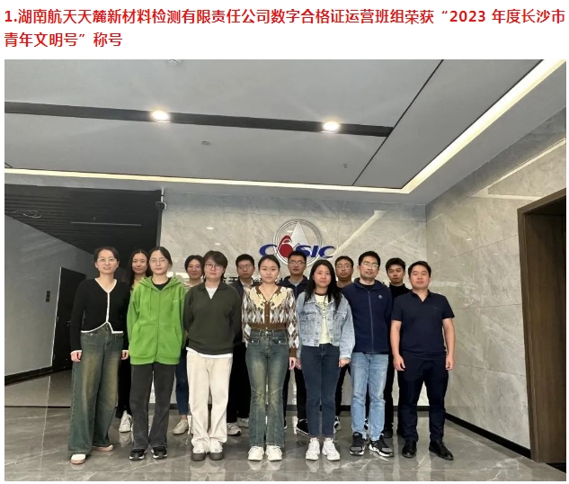 湖南航天天麓新材料檢測有限責任公司數字合格證運營班組獲評“2023年度長沙市青年文明號”稱號;航天科工(長沙)新材料研究院有限公司鎂合金結構件生產青年突擊隊獲評“長沙市青年突擊隊建功行動優秀青年突擊隊”稱號;航發公司周紅獲評“2023 年度長沙市青年崗位能手”稱號。