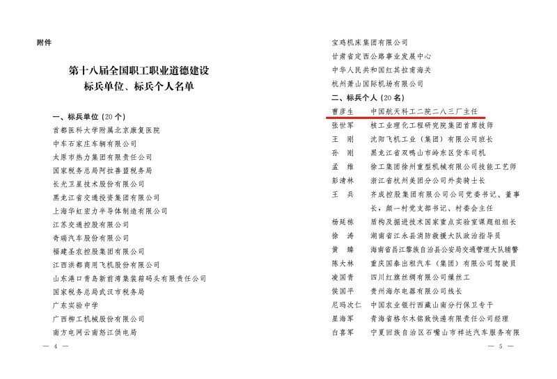 近日,中國航天科工二院283廠職工曹彥生獲得第十八屆全國職工職業道德建設標兵個人稱號。