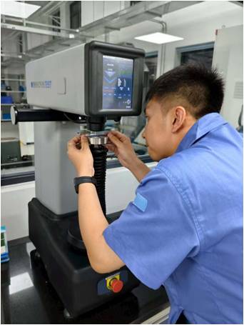 位于701庫(kù)的性能組實(shí)驗(yàn)室里燈火通明,試驗(yàn)機(jī)與洛氏硬度計(jì)發(fā)出持續(xù)不斷的規(guī)律蜂鳴。性能組組長(zhǎng)黃姐和組員小王被堆積如山的待檢樣品包圍。每一份樣品都需經(jīng)受嚴(yán)格考驗(yàn):電子萬(wàn)能試驗(yàn)機(jī)上,金屬樣條被緩緩拉長(zhǎng)直至斷裂,電腦屏幕實(shí)時(shí)繪制著反應(yīng)材料強(qiáng)度的拉伸曲線;洛氏硬度計(jì)旁,檢測(cè)員凝神屏息,在無(wú)數(shù)樣品表面精準(zhǔn)施壓,記錄著一個(gè)個(gè)硬度數(shù)據(jù)點(diǎn)。連續(xù)數(shù)小時(shí)高強(qiáng)度操作,手臂早已酸痛難當(dāng),目光卻依舊如炬,牢牢鎖定每一個(gè)讀數(shù)、每一個(gè)數(shù)據(jù)點(diǎn)。