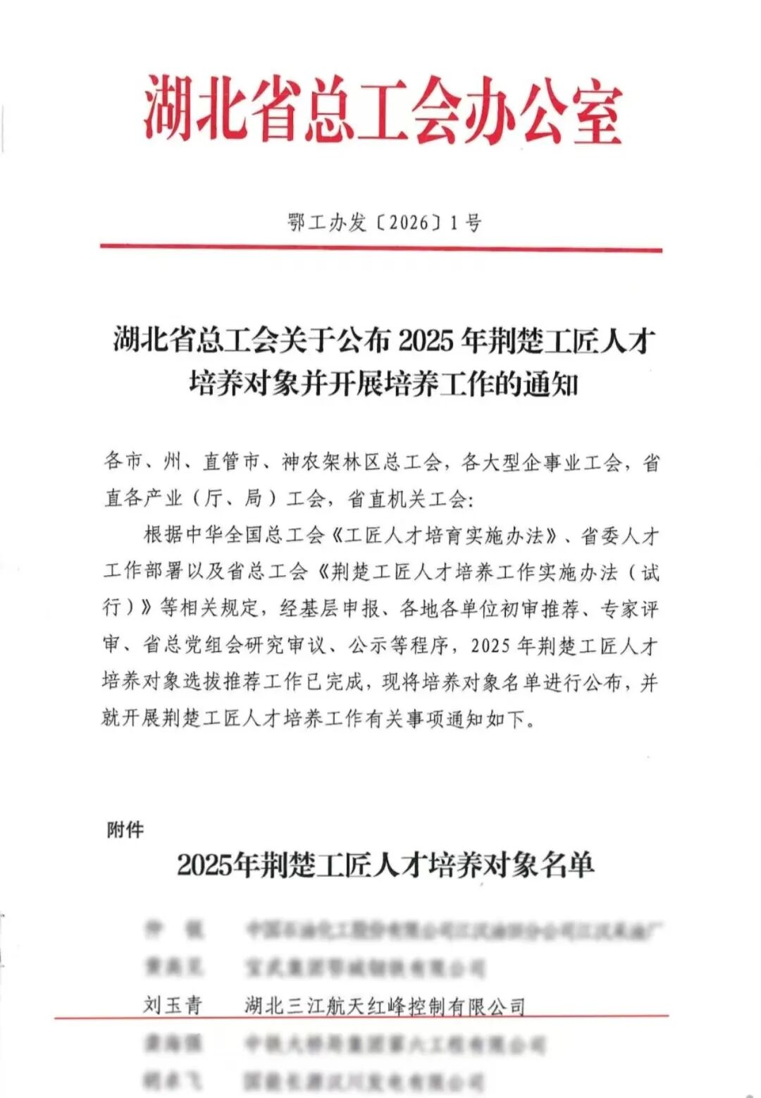 近日,湖北省總工會公布2025年荊楚工匠人才培養對象名單,航天科工九院紅峰公司職工劉玉青成功入選,培養期為2年。